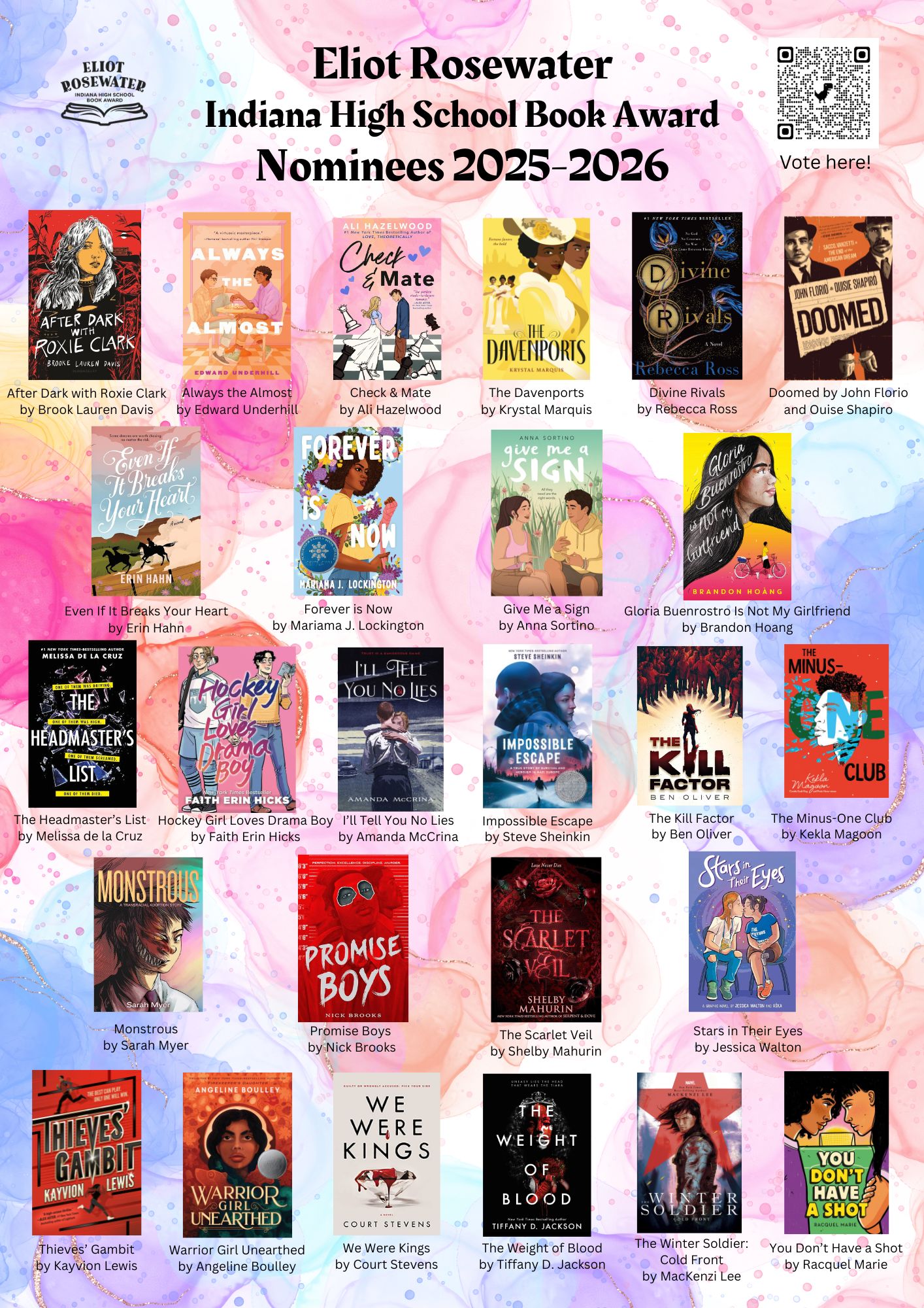 The Eliot Rosewater Indiana High School Book Award (Rosie Award) is chosen annually by students across Indiana in grades nine through twelve. Students at participating high schools, public libraries, or homeschoolers who read any of approximately 20 nominated books are eligible to rate each book they've read.